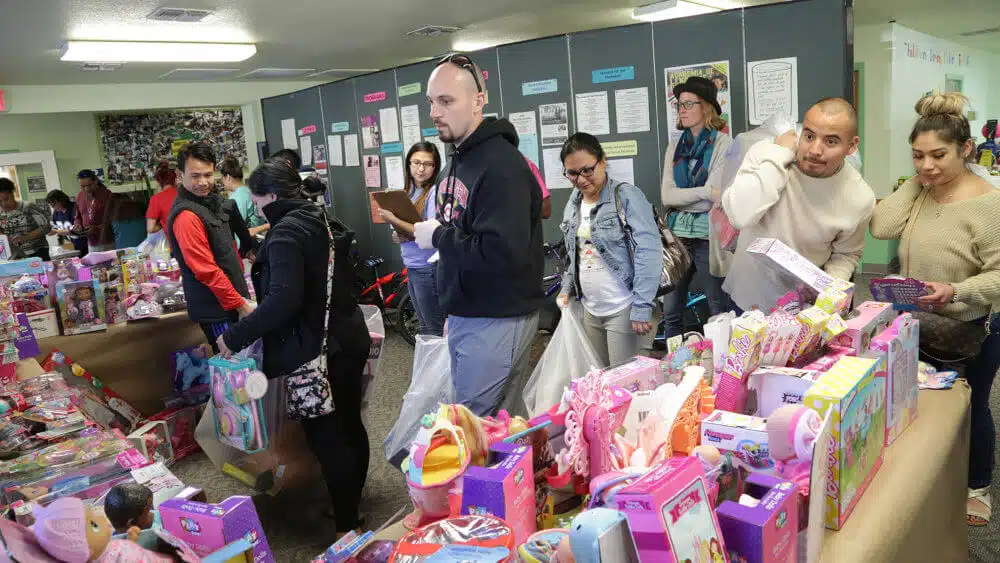 The week before, Rod Radle, ICD’s co-director, walked to each of their homes and delivered two tickets. By lunchtime, the line outside had morphed into a neighborhood function, with small talk and friendly exchanges among neighbors passing the time, eager to play the role of Santa for their kids.