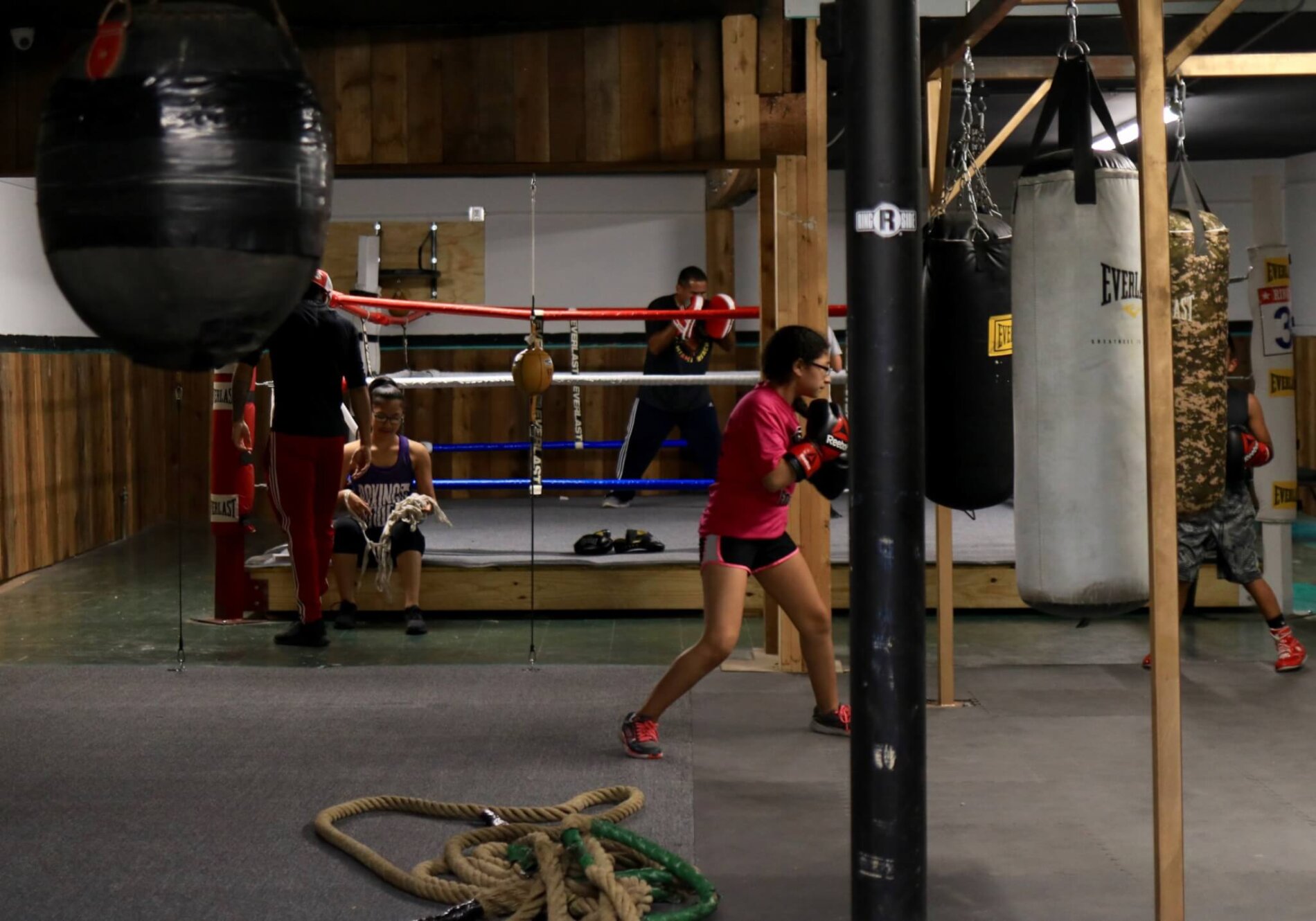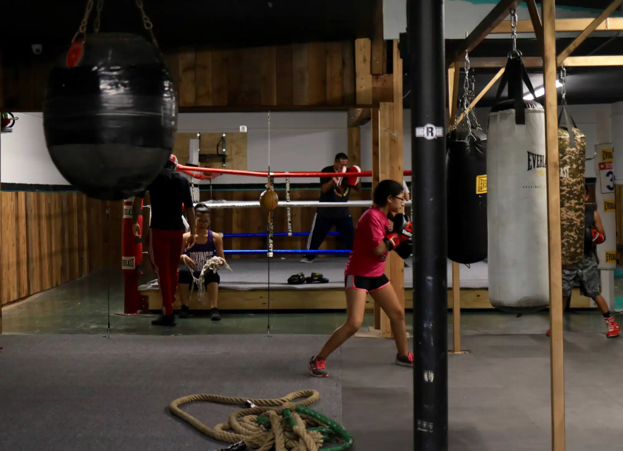 Inside Cardona’s Boxing Gym, six heavy bags dangle from a gold rack; against the wall to the left sits a photo of Muhammad Ali and a framed certificate of occupancy. Yellow double-end bags hang in front of the red, white and blue roped ring. The loud speed bags — thappita, thappita, thappita, thappita — and flags decorate the walls surrounding the ring.