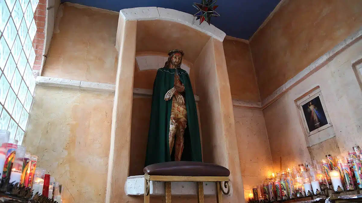 The statue of a gory, bloodied and crucified Jesus Christ, surrounded by more than 30 prayer candles and a Holy Water dispenser, is a popular place for residents of this West Side neighborhood day and night.