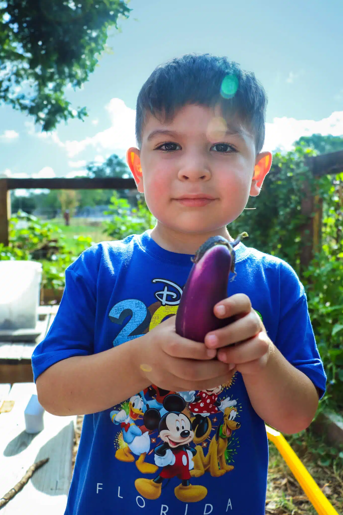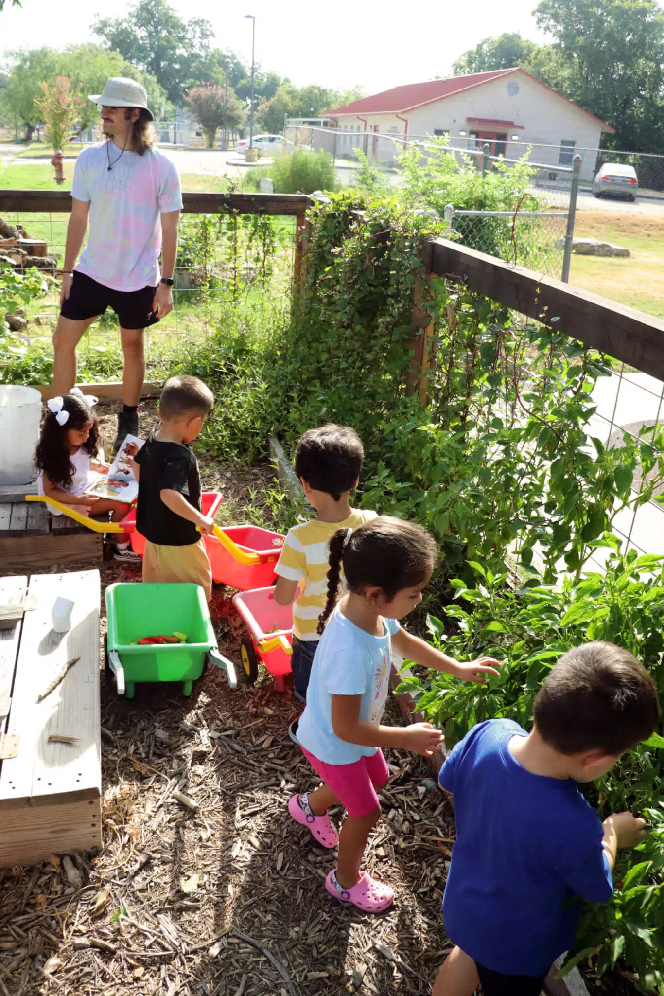 It’s 9:00 a.m. on a Thursday morning, the summer heat hasn’t overtaken the day yet, and a class of curious three-year-olds are pushing their mini red and yellow wheelbarrows around a preschool garden.