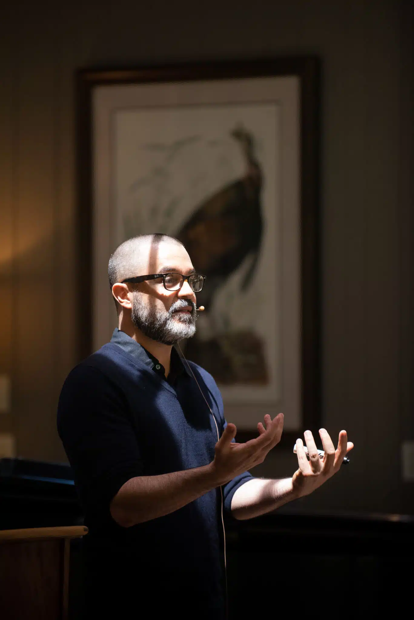 Bruner walks back and forth in front of a Great Hall brimming with Lodge guests, reading from the Scriptures, gesturing toward the white board, cracking wise here and there, and calling out some version of “Is this making sense?” over and over again.