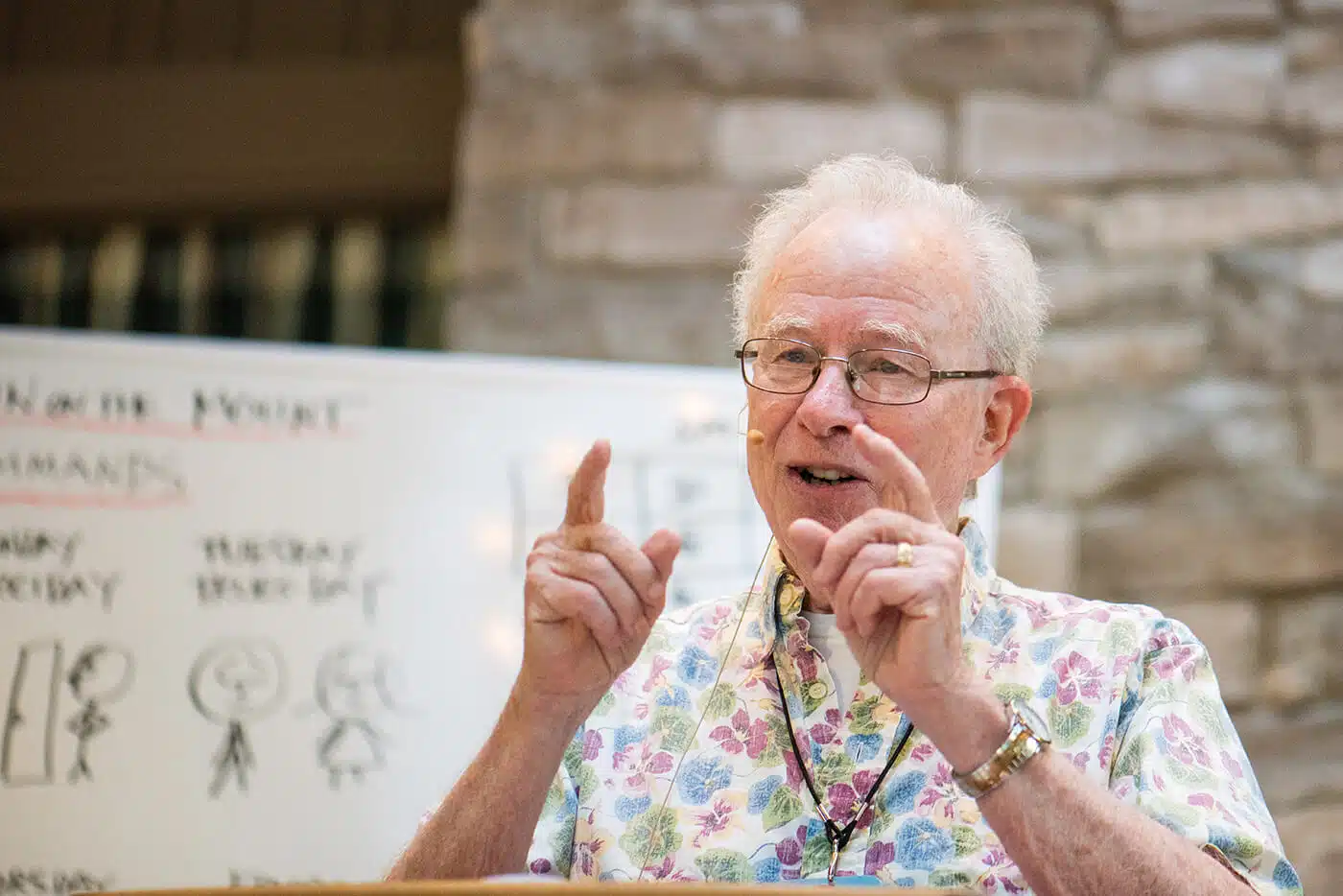 It’s an overcast Friday on the first morning of what will likely be the last-ever Laity Lodge retreat to feature theologian Dr. Dale Bruner as a guest speaker. Bruner stands at the front of the Great Hall and fills a large white board with a series of playful stick figures meant to elucidate elements of Jesus’ teaching in the Sermon on the Mount and what Jesus was trying to tell us about power, peacemaking, and more.