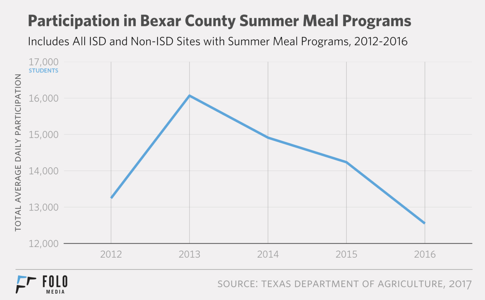 In Bexar County, there has been a 17 percent drop in the number of sites open in August since 2013. Most of that loss occurred between 2013 and 2014, when the Society of St. Vincent de Paul of the Arch Dioceses of San Antonio, a charitable catholic organization, stopped participating in the federal programs. The organization sponsored 62 sites in 2013.