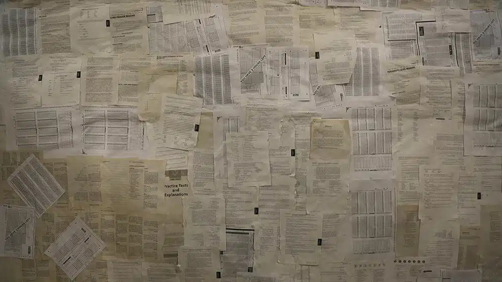 The largest installation at the exhibit, which is hosted by the educational arts program SAY Sí, is a paper mache maze completely covered with copies of standardized tests.