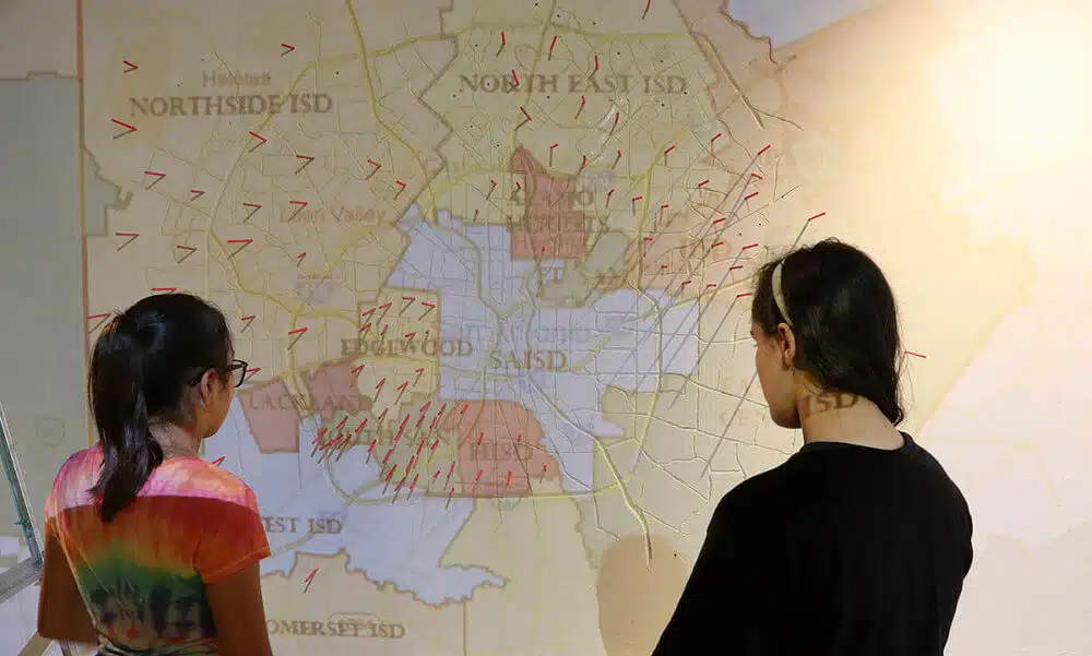 Another one of the larger installations is a wall projection that shows a map of San Antonio and its school districts represented by different colors. Variously colored pencils pinned onto the map represent a student’s ethnicity and the number of dropouts within that district.
