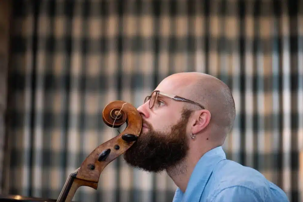 The culmination of the three-day retreat was the Saturday night concert: Jac’s compositions had their debut, performed by Bethany Ring, soprano; Amber Salladin, alto and piano; Nathan Williams, clarinet; and Steuart Pincombe, cello. The music was interspersed with sonnets read by Malcolm, all surrounded by the images of Bruce’s Ordinary Saints.