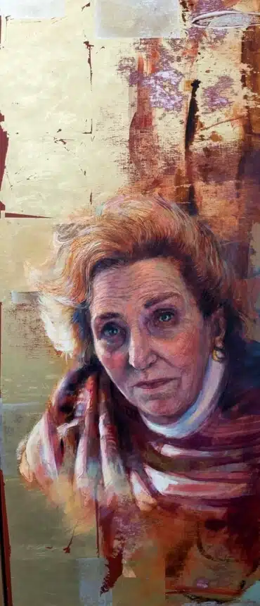 Bruce’s detailed work interplays with gold and silver leaf and swashes of color, and at the Cody Center gallery they also interplayed with sonnets penned by Malcolm and musical compositions by J.A.C. (“Jac”). The three friends worked to explore these rich themes in poems and music that respond to the portraits.
