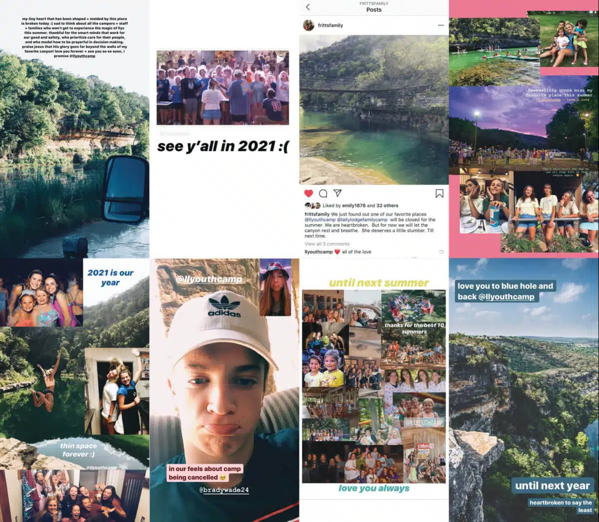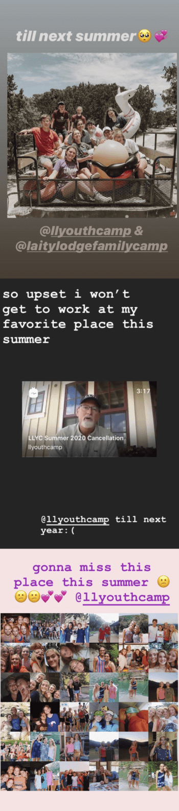 “My tiny heart that has been shaped and molded by this place is broken today. 🙁 Sad to think about all the campers and staff and families who won’t get to experience the magic of LLYC this summer. Thankful for the smart minds that work for our good and safety, who prioritize care for their people, and who model how to be prayerful in decision making. Praise Jesus that His glory goes far beyond the walls of my favorite canyon! Love you forever and see you so so soon, I promise.”